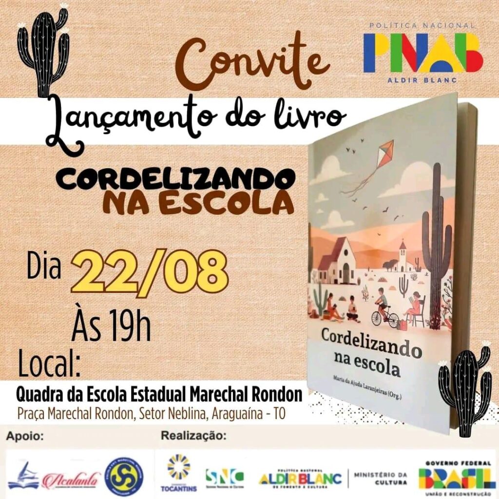 No próximo dia 22 de agosto, às 19h, a Quadra da Escola Estadual Marechal Rondon, em Araguaína, será palco de uma celebração à literatura e ao poder transformador da educação. A data marca o lançamento do livro Cordelizando na Escola, obra organizada pela professora e escritora Maria da Ajuda Gomes Laranjeiras, que reúne produções autorais […]